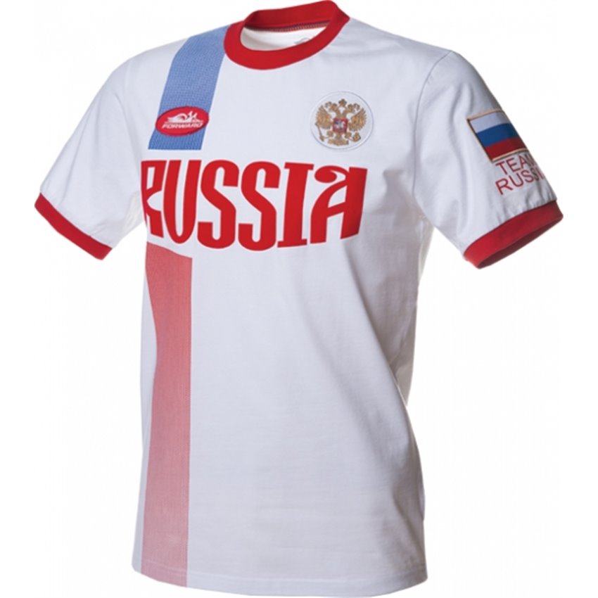 Изделие прямого силуэта, рукав втачной. Круглый вырез горловины обработан воротником-стойкой.Воротник изготовлен из полотна ластик 1*1. Состав - 95% хлопок, 5% эластан, 180г/м2. Нанесения: шеврон логотипа, шеврон ARMS, шеврон FLAG, жаккардовый лейбл FORWARD, принт TEAM RUSSIA, флок принт RUSSIA, принт EAGLE, принт RUS, голограмма.