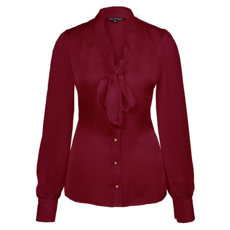 Нарядная блузка на золотых пуговицах. Глубокий, но узкий вырез горловины дополнен стильным и женственным бантом. Красивые манжеты застегиваются на три такие же пуговички. Модель замечательно сочетается с разными элементами одежды.